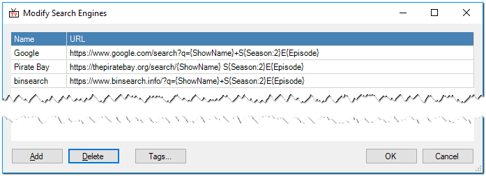 The Modify Search Engines window controls TV Rename’s outgoing interface with the world (other than TheTVDB). Here, you can configure how and where TV Rename points a web browser searching for files.