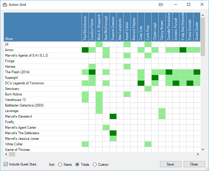 Ticking the âInclude Guest Starsâ box will expand the grid further to include guest stars of the shows (in light green). Sorting on âNameâ will re-arrange the data alphabetically by actor name and by show name. Clicking on âTotalsâ will place the show with the most actors at the top of the list and the actor in the most shows to the left of the list.