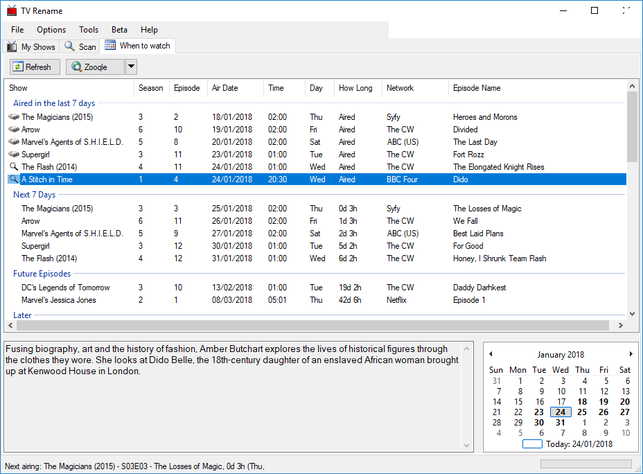 Looking at the list in the main panel we see details of recent and future show episodes matching the TV shows found in the media library.